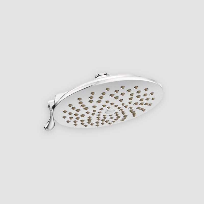 Two-function 8″ diameter rain-shower shower head with Moen 151380 Shower Arm in lieu of standard shower head (Not in addition to). Option for ceiling mount available.